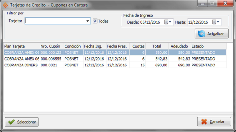 Se agregó la posibilidad de anular un cupón ya generado, para ello se agregó el botón “Cupones en cartera” en la solapa “Tarjetas”. Este abre la ventana “Tarjetas de crédito – Cupones en cartera” la cual lista los cupones del cliente que no han sido acreditados.